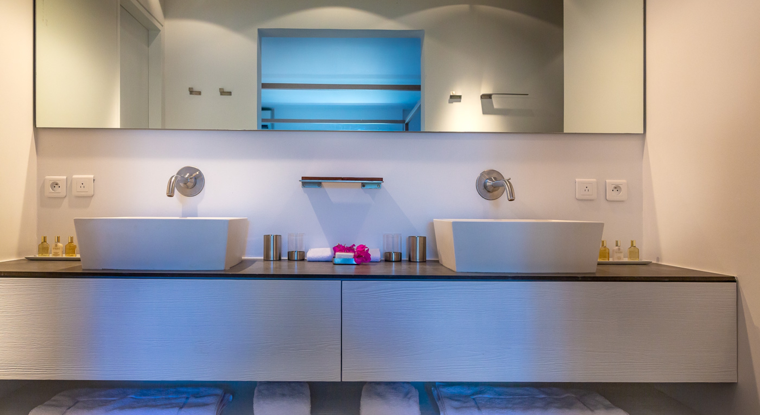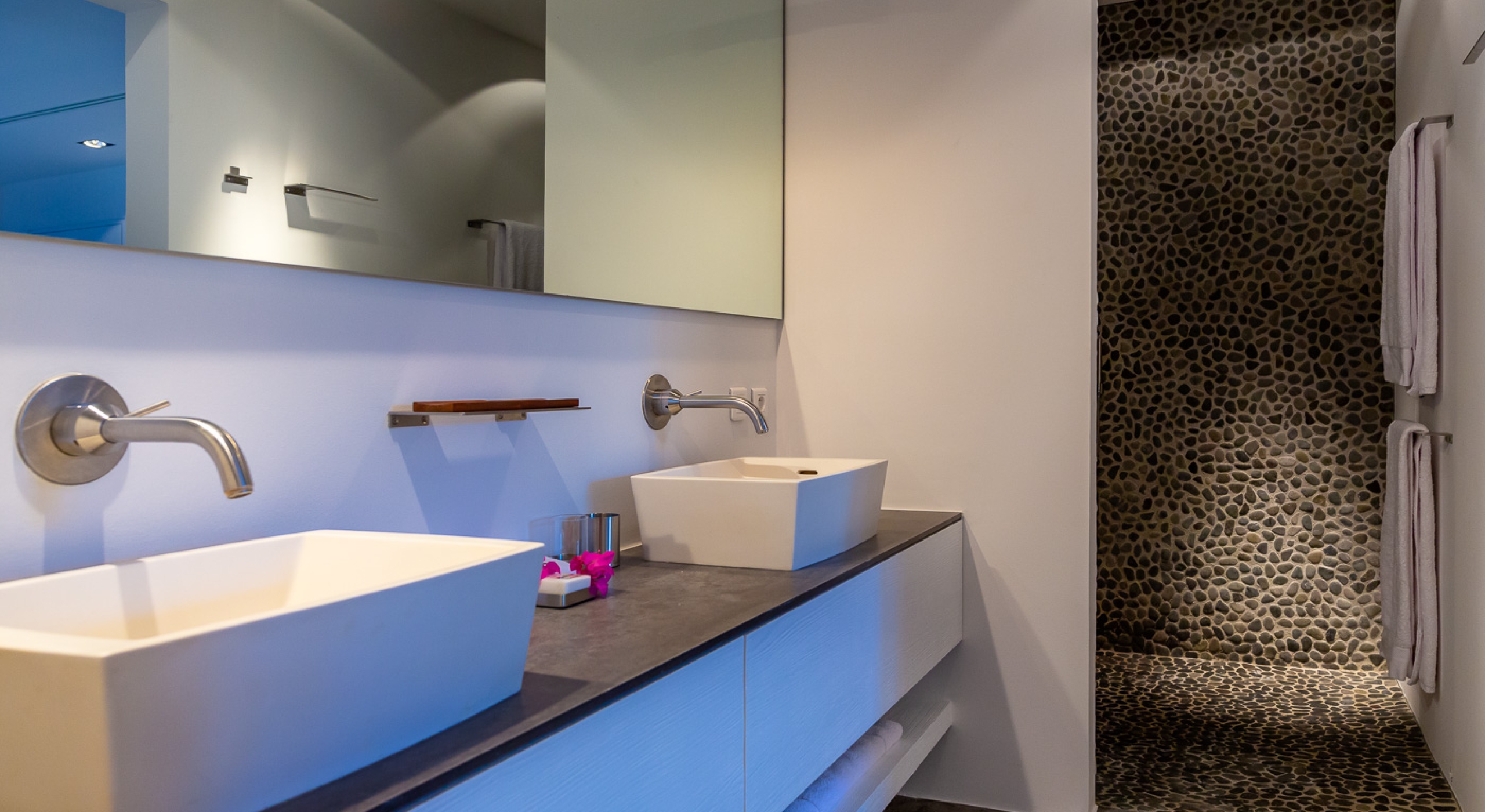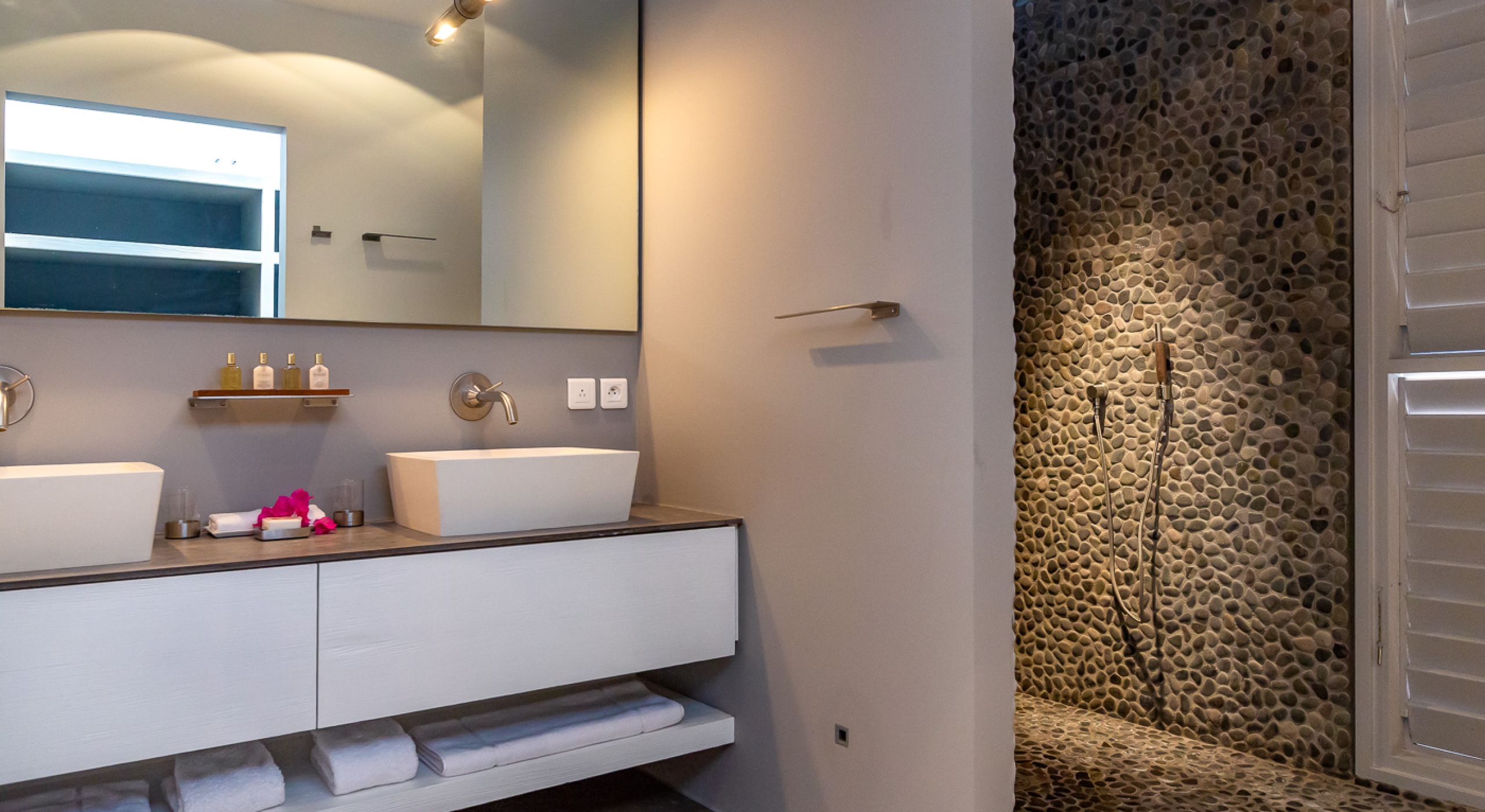 Two bedrooms, situated on the first floor, with a private terrace, offer a beautiful view on the bay. The third bedroom is situated on the main level. Every bedroom has its own bathroom as well as an outside shower. Eden House is an ideal villa for holidays with friends.|